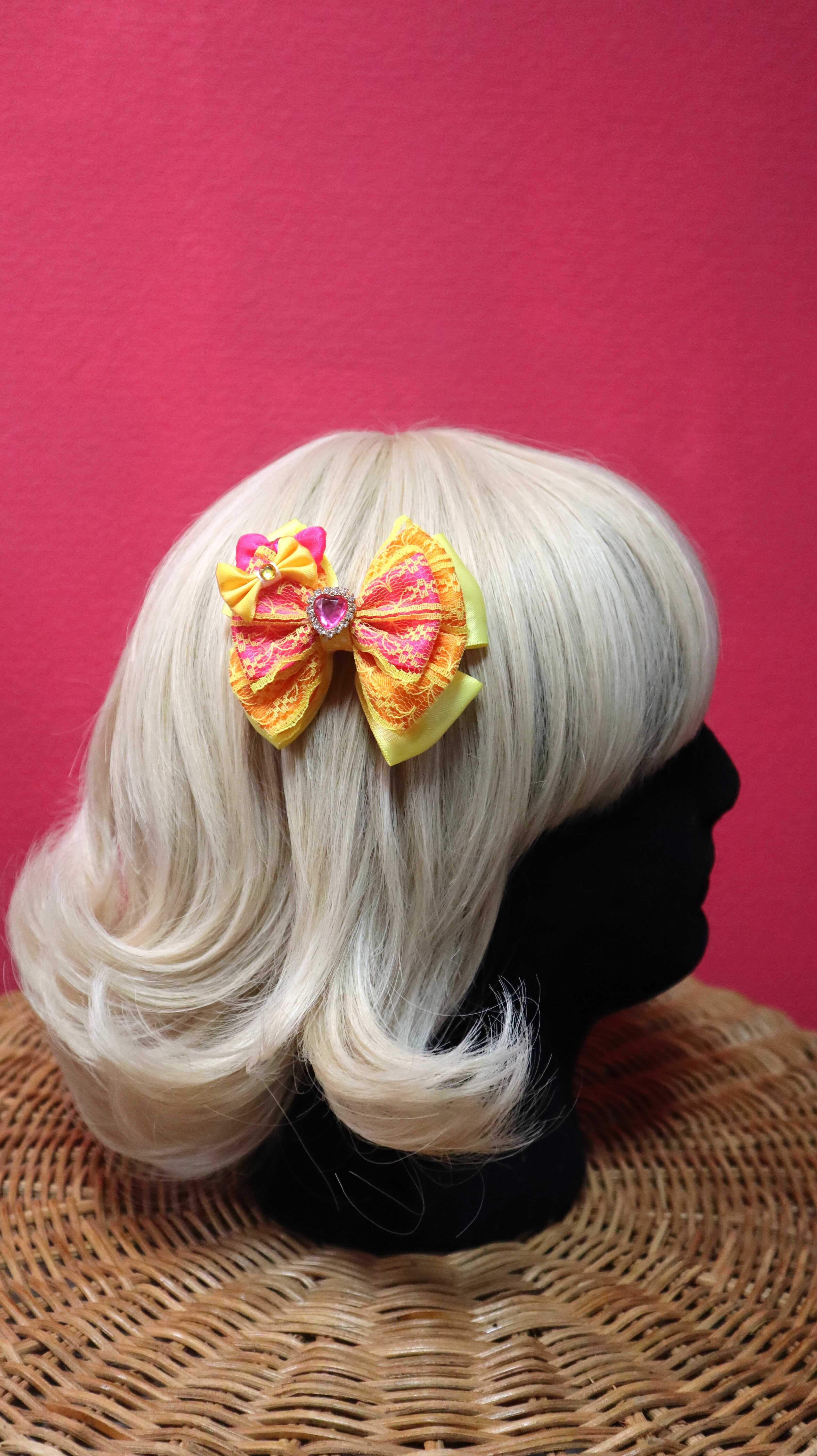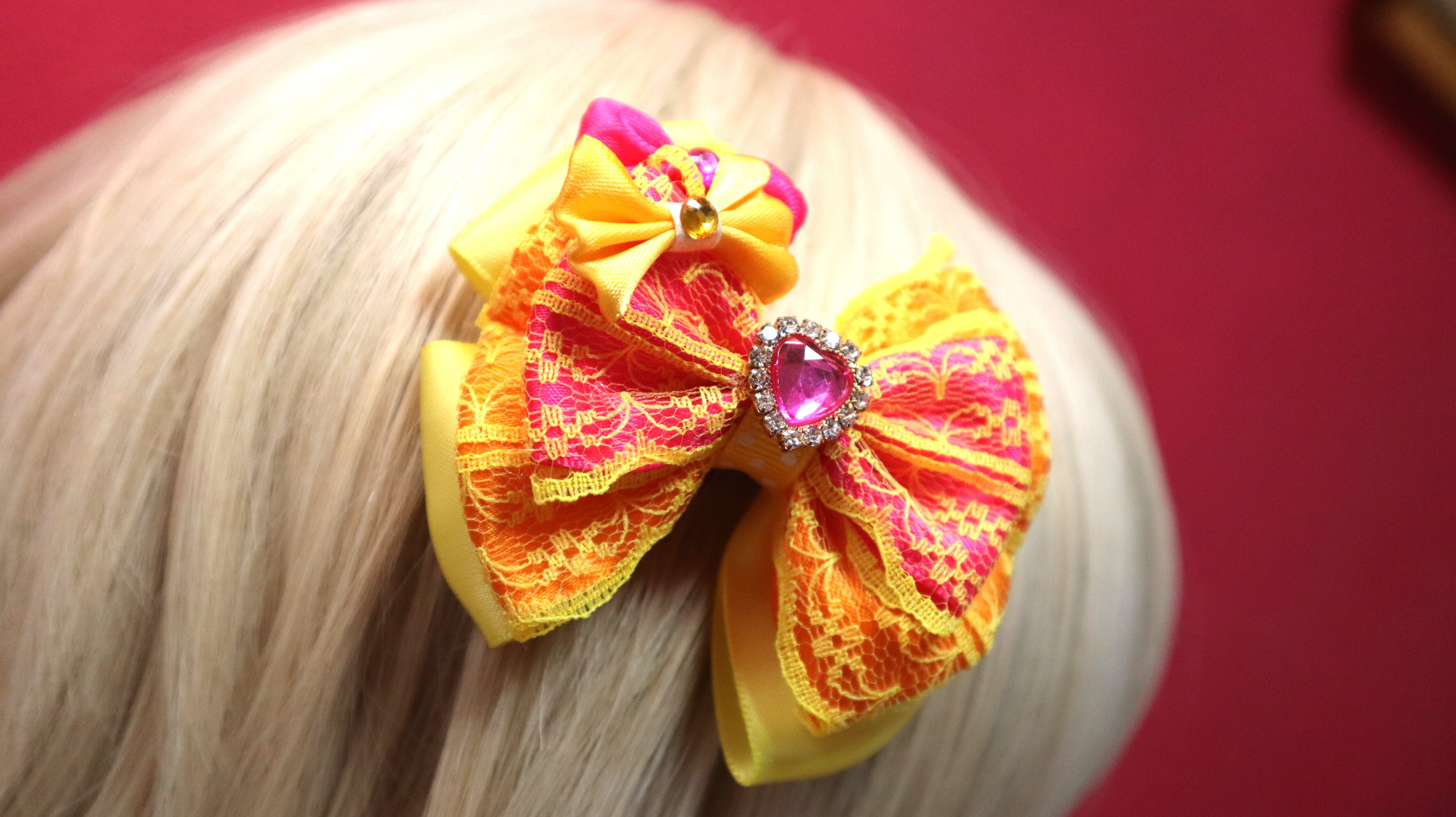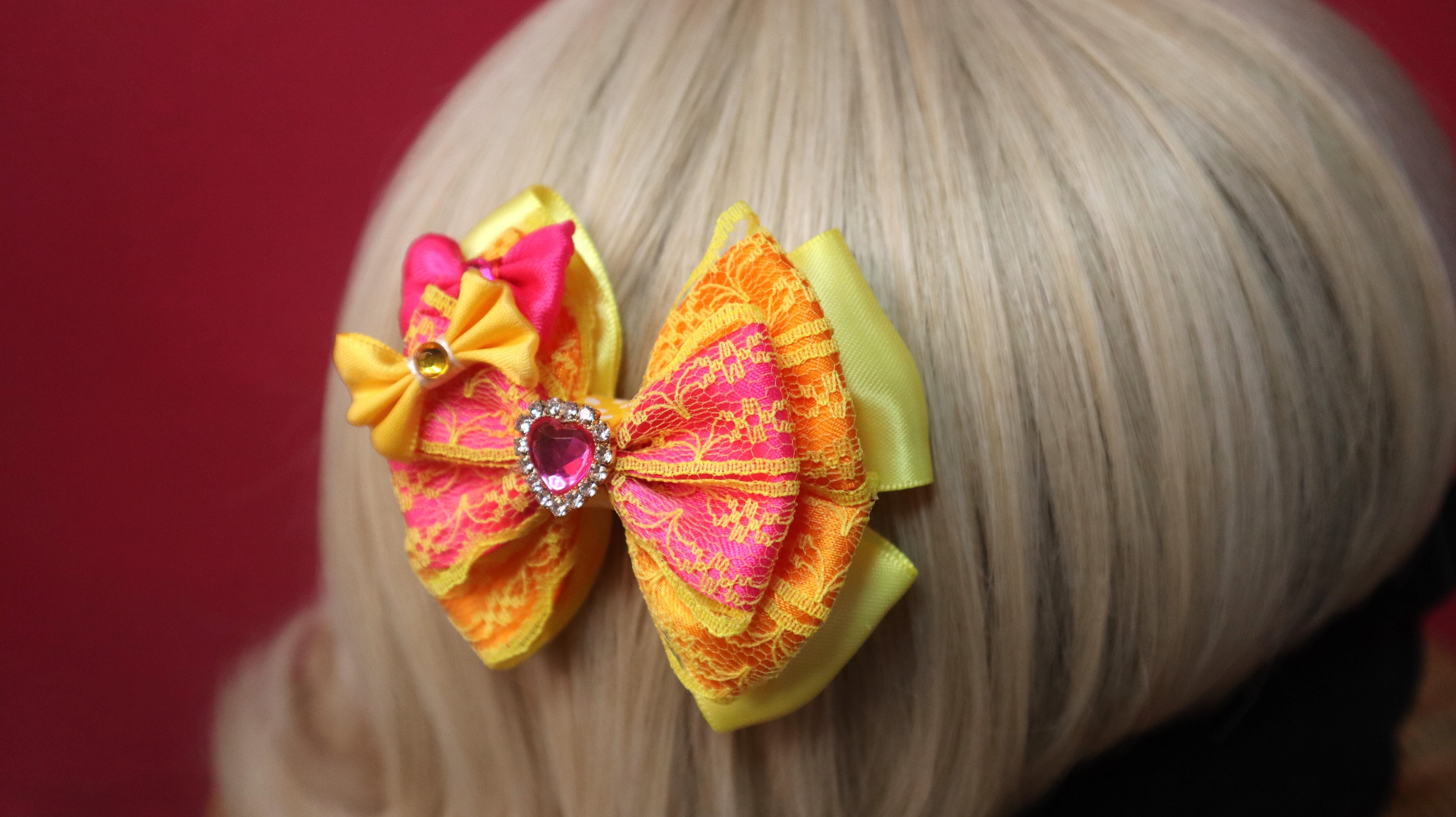 ショッキングピンク×オレンジ×イエロー/センター♡リボン/レースリボン/ヘアクリップ