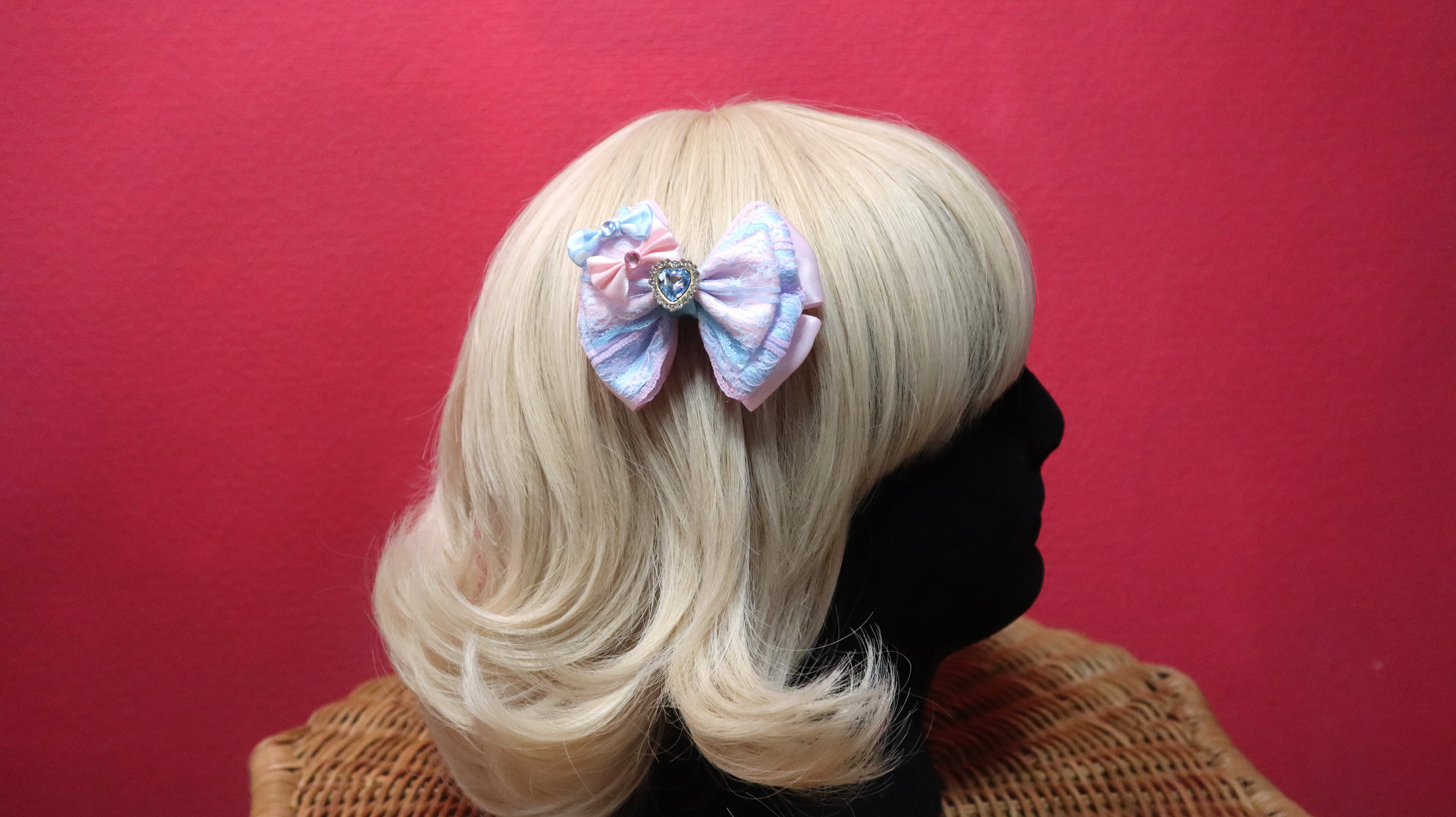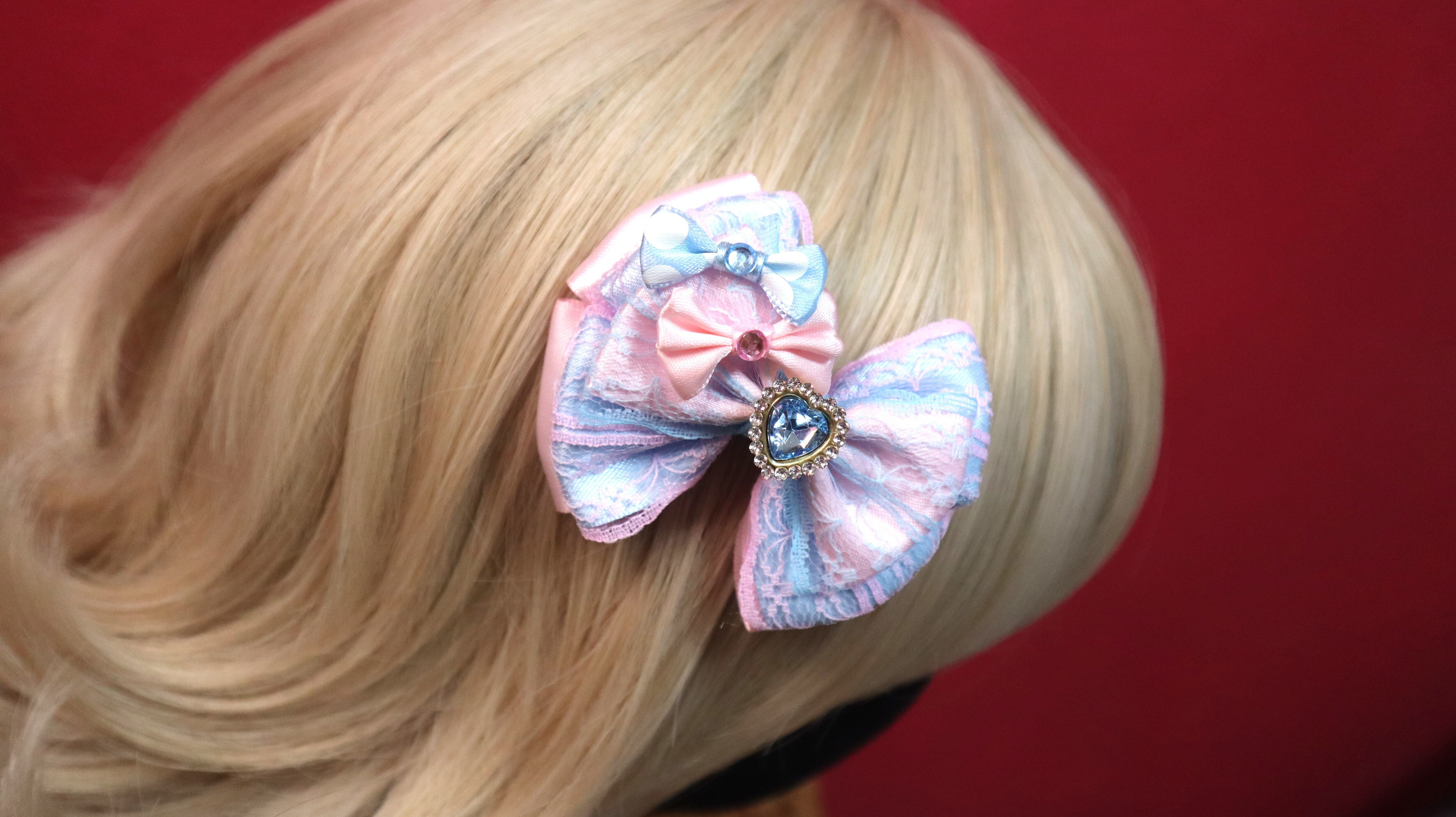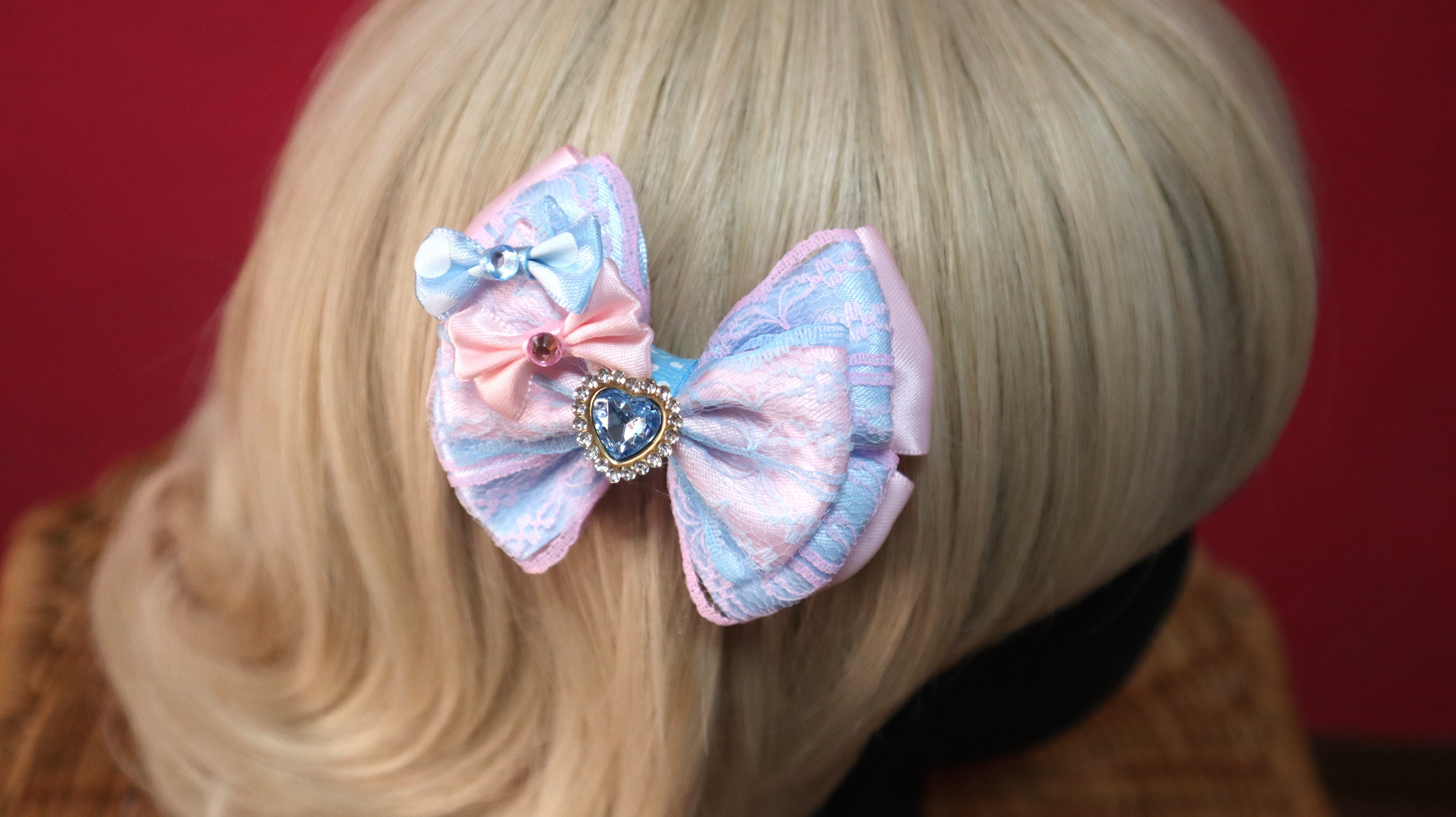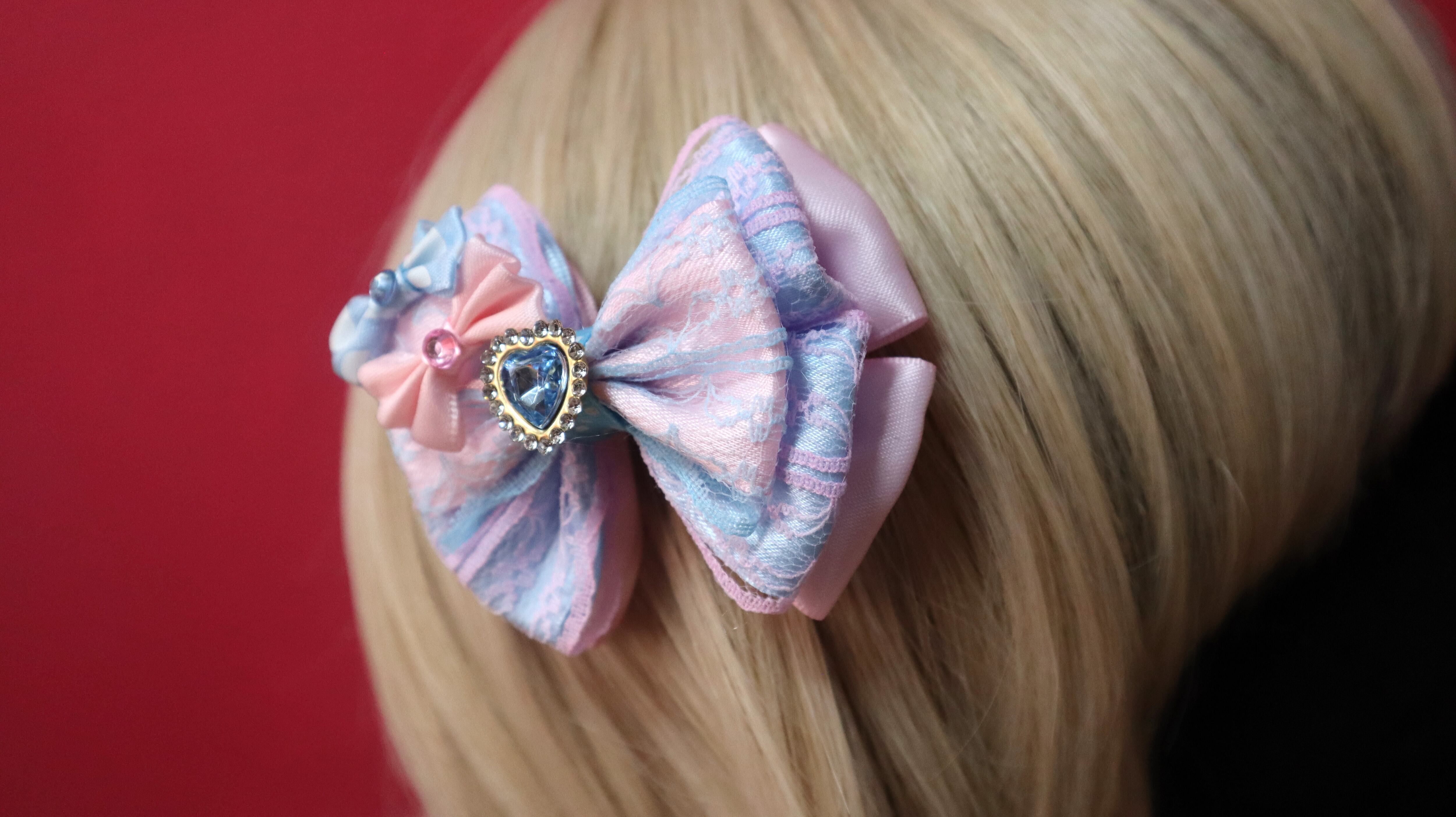 ピンク×水色/真ん中♡リボンシリーズ/レースリボン/ヘアクリップ