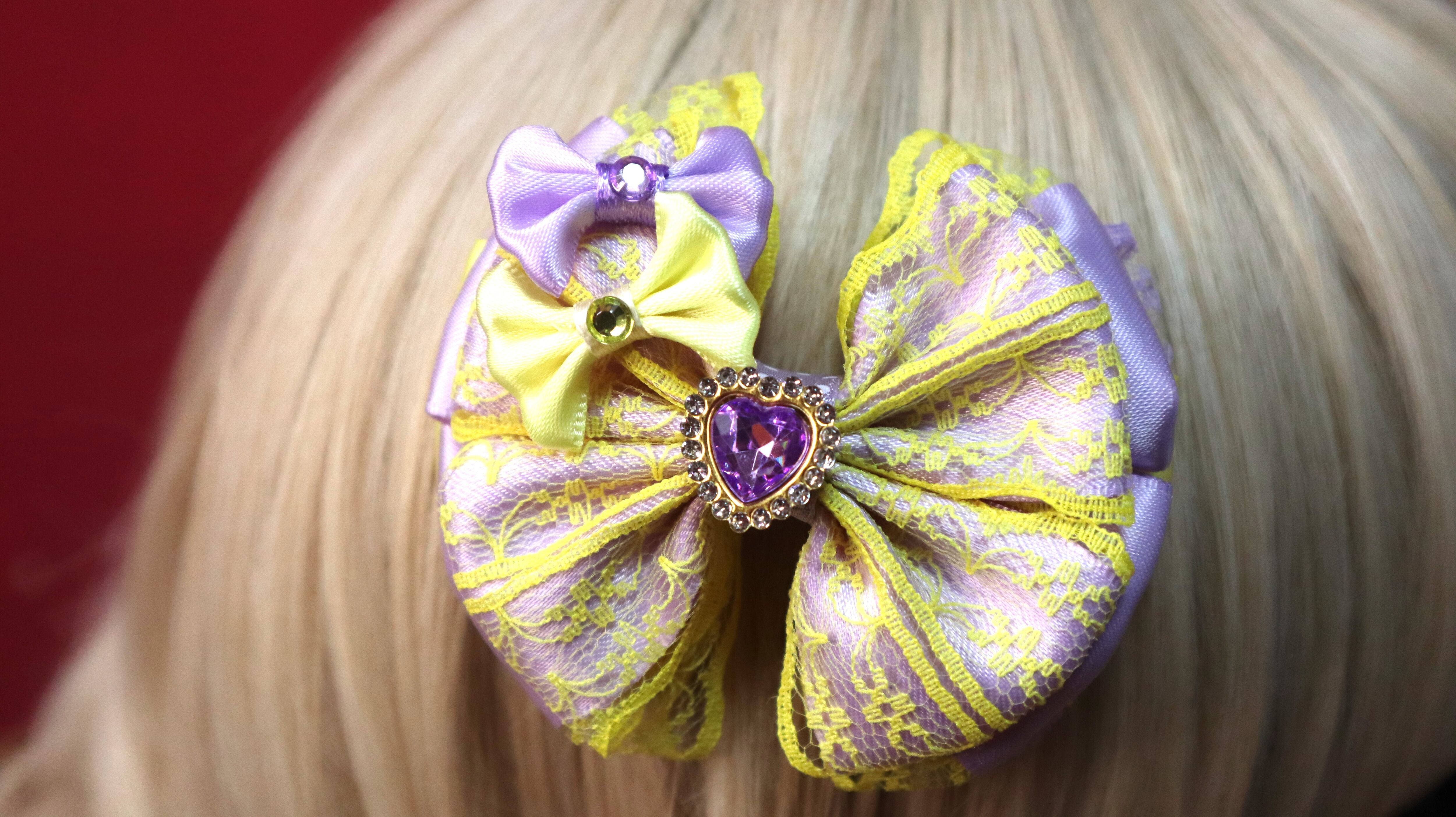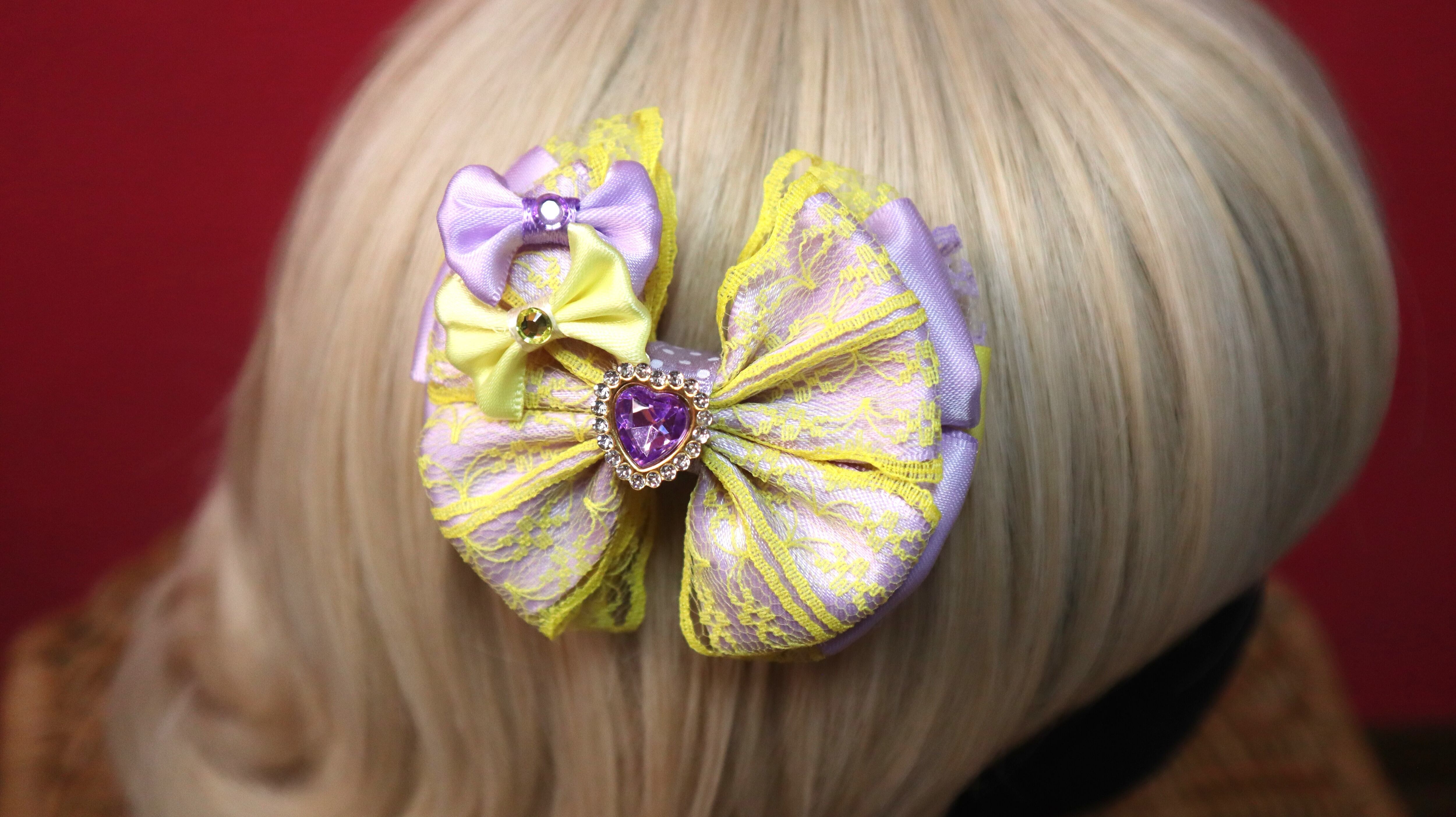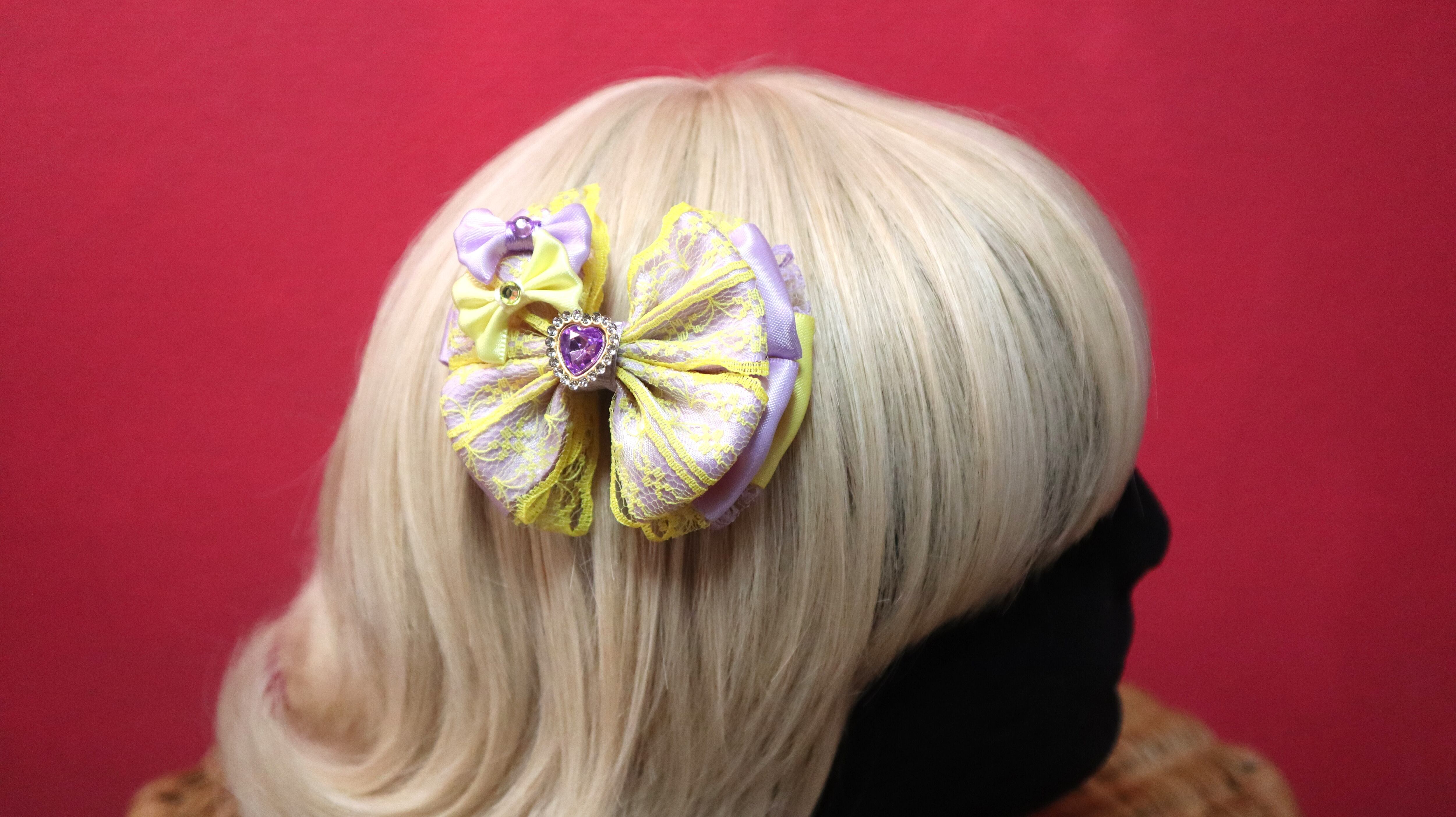 パープル×イエロー/真ん中♡シリーズリボン/レースリボン/ヘアクリップ