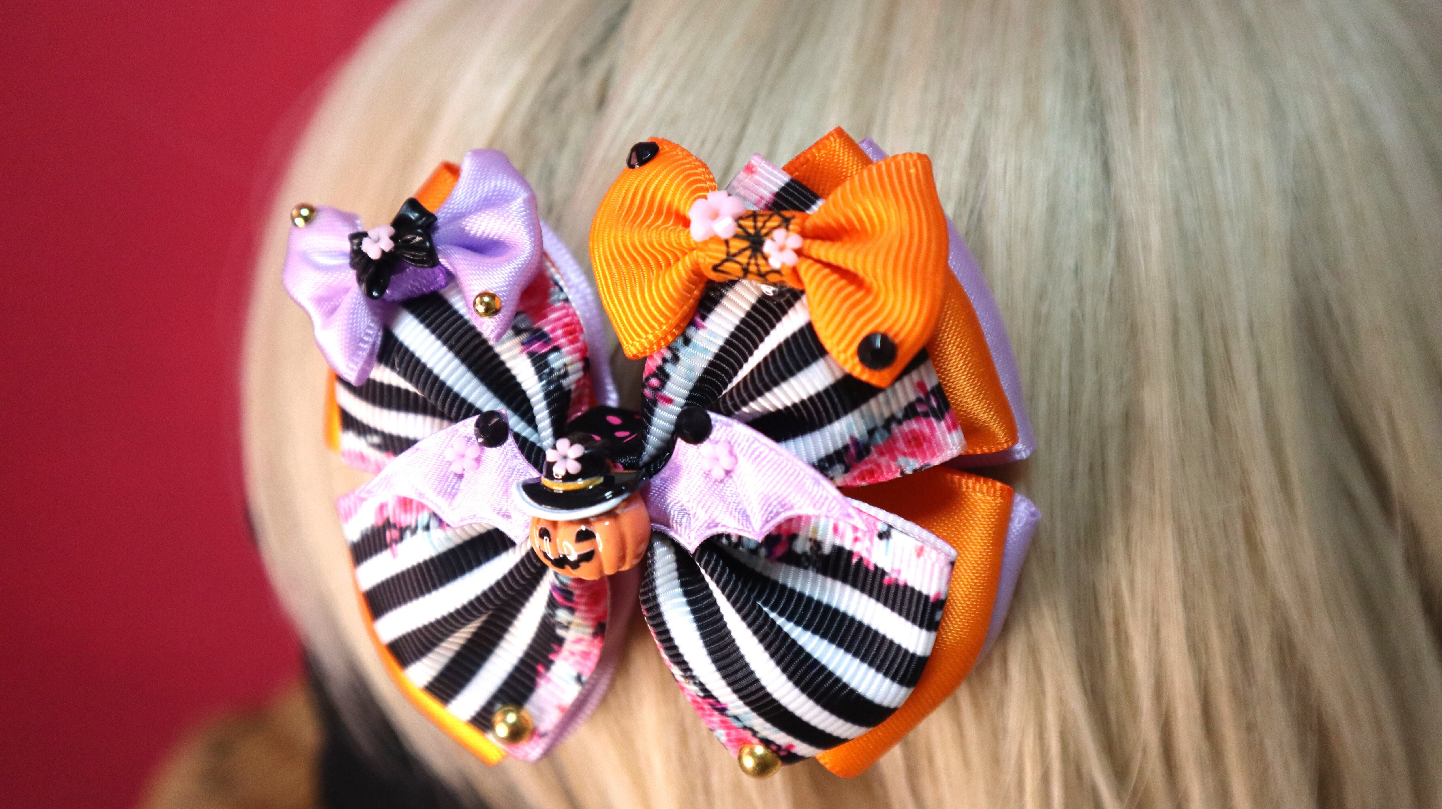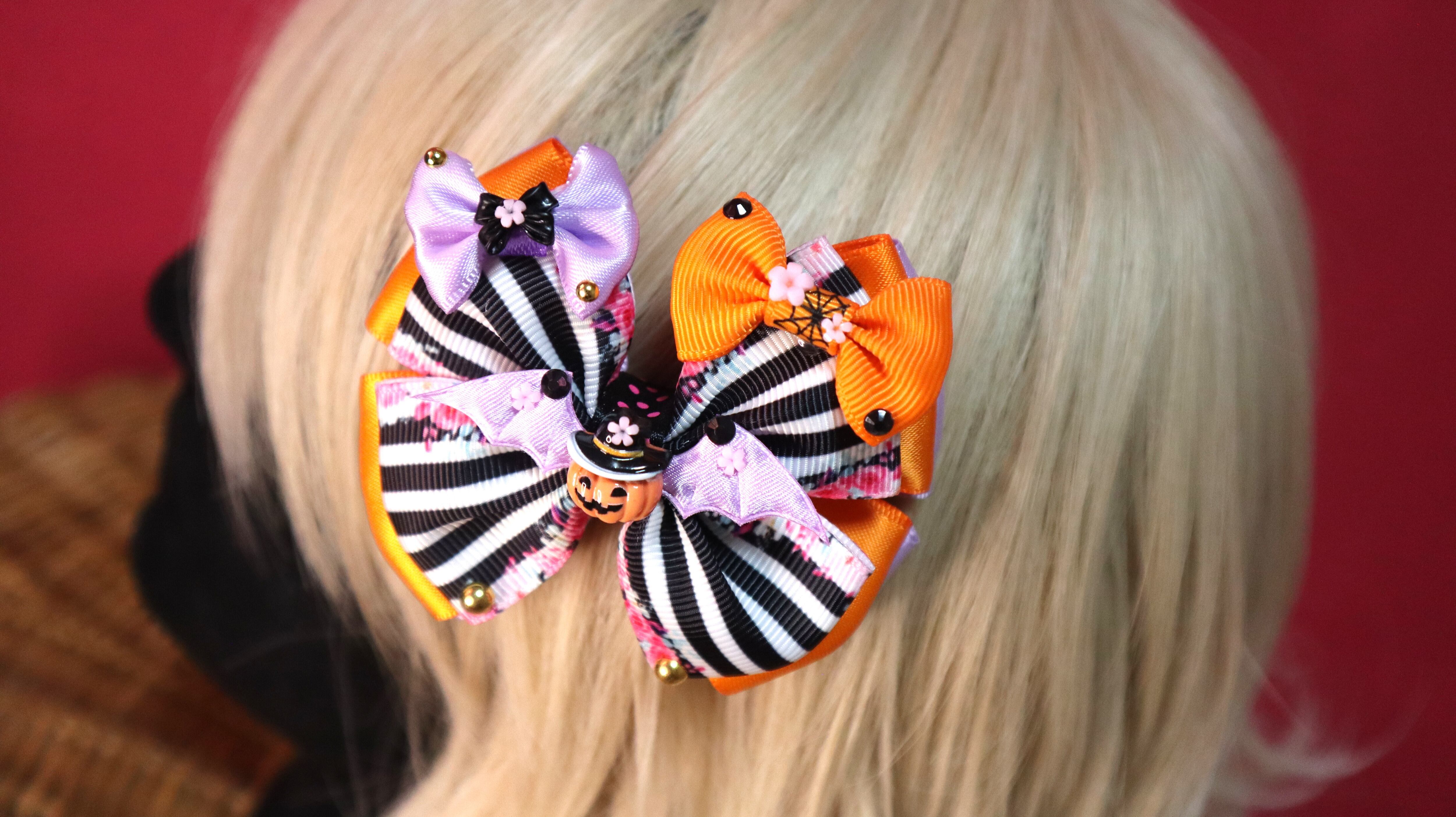 ラベンダーのコウモリの羽にしたので、すこし柔らかい雰囲気のあるハロウィンリボンになりました♡