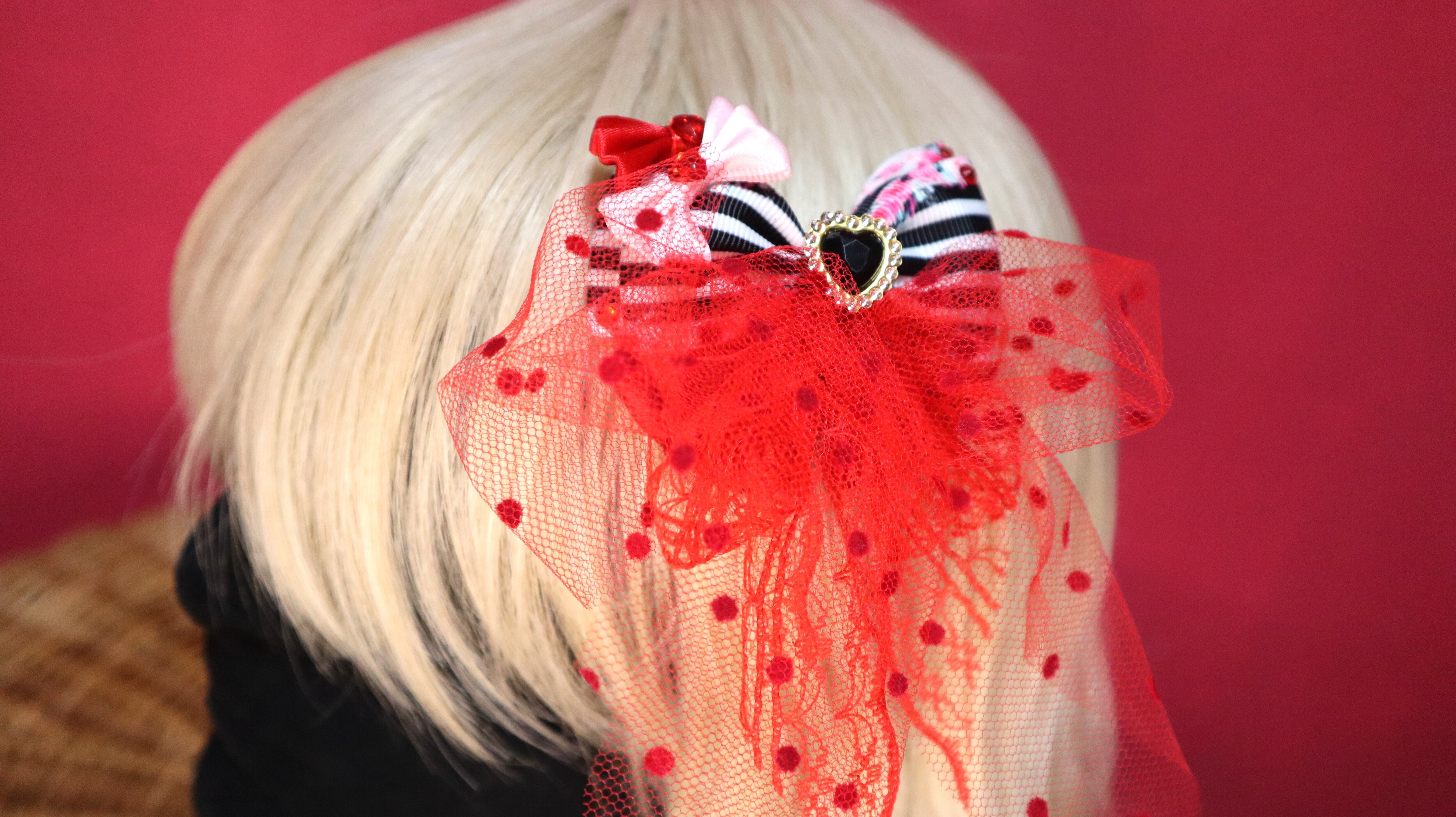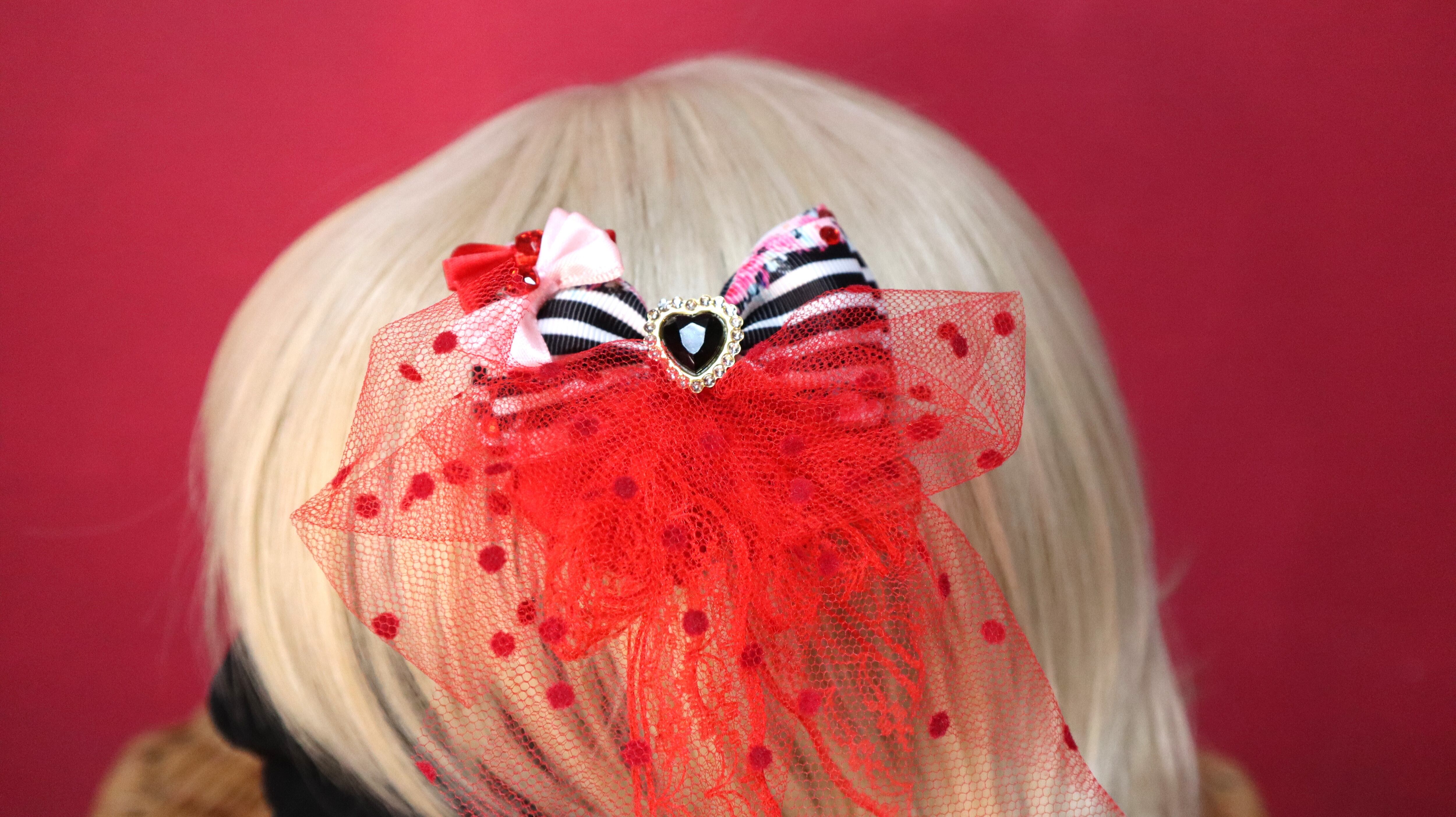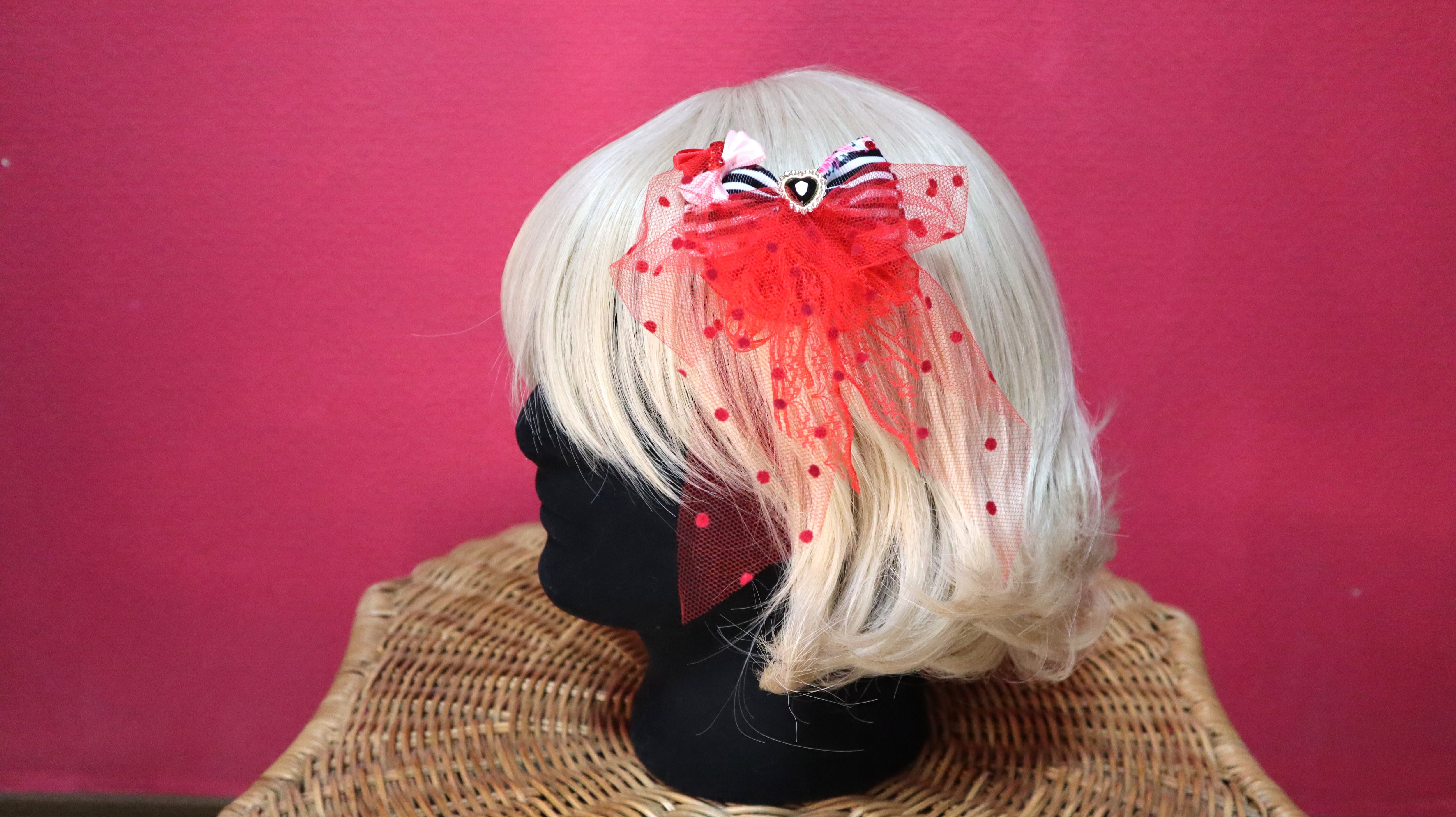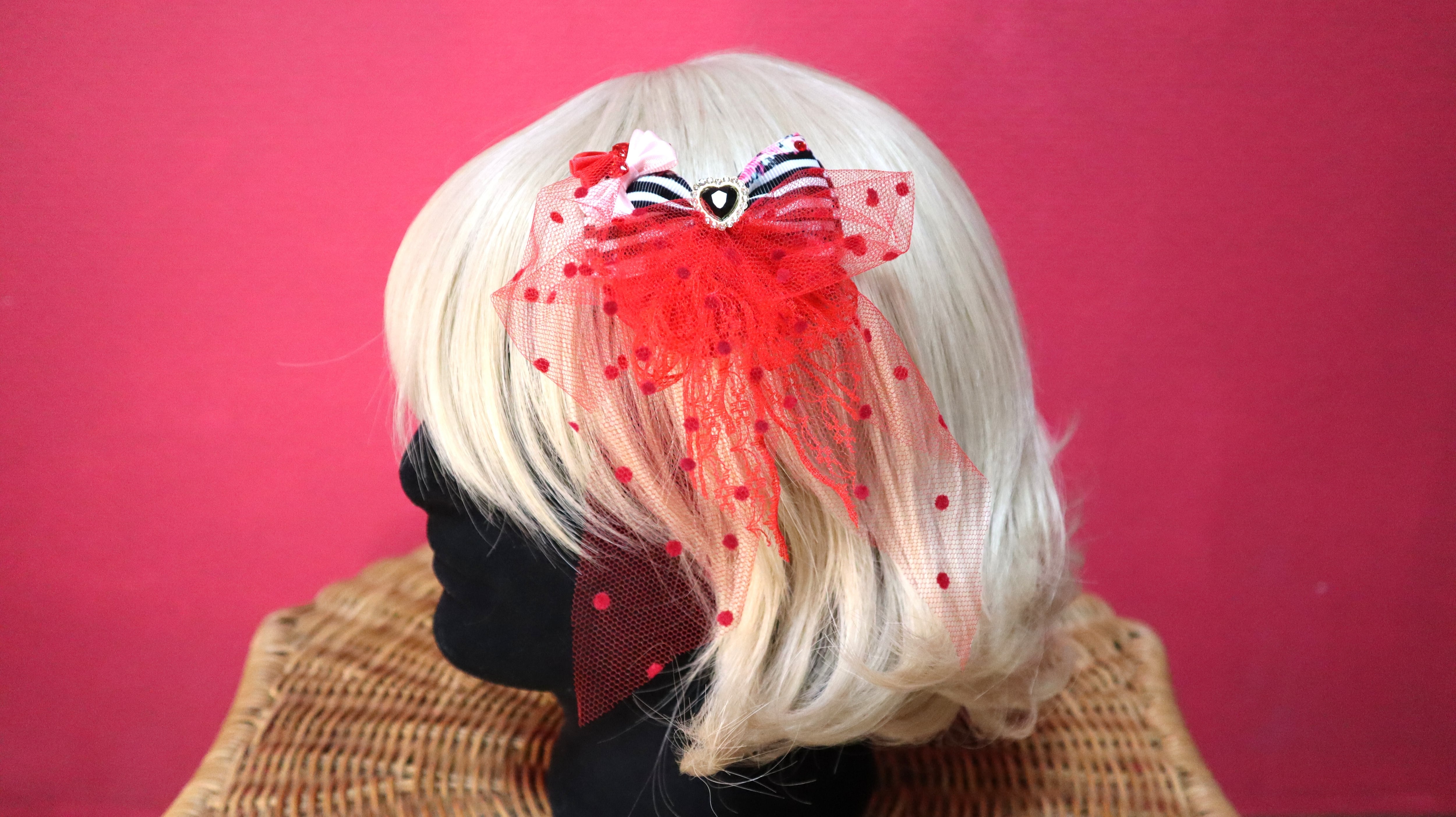 レッド系/レッドドットチュールリボン/ボーダーリボン/真ん中♡/ヘアクリップ