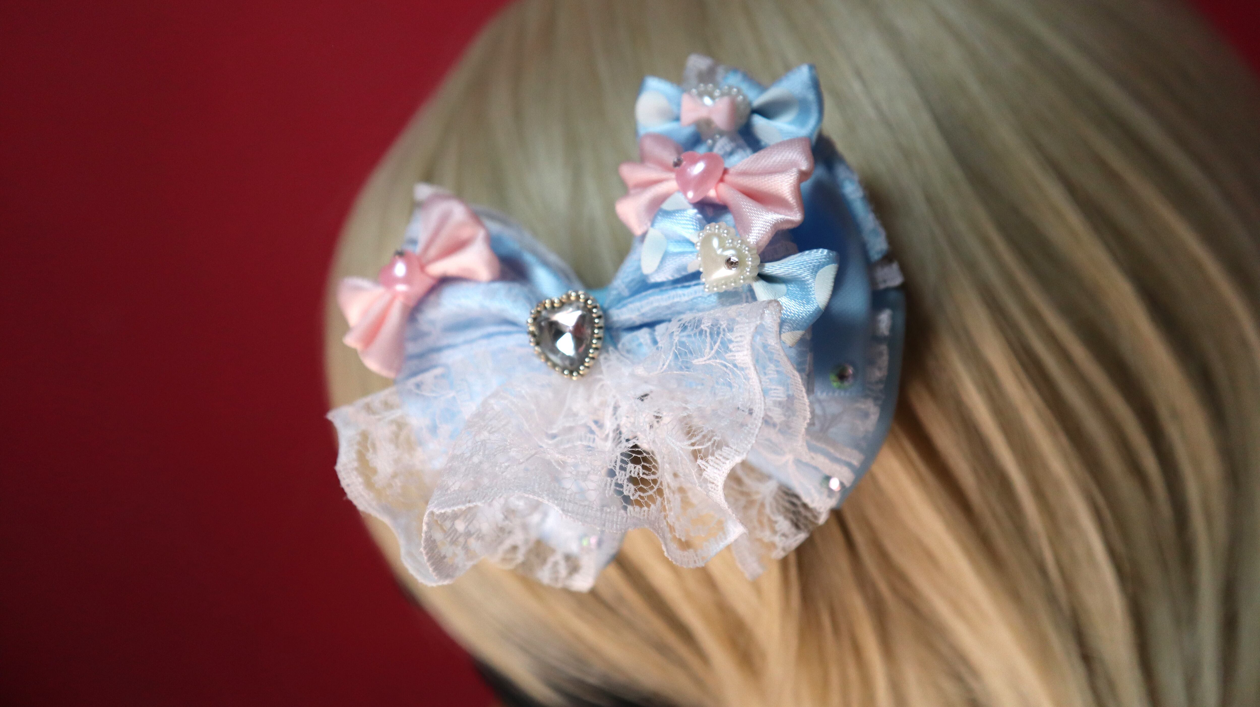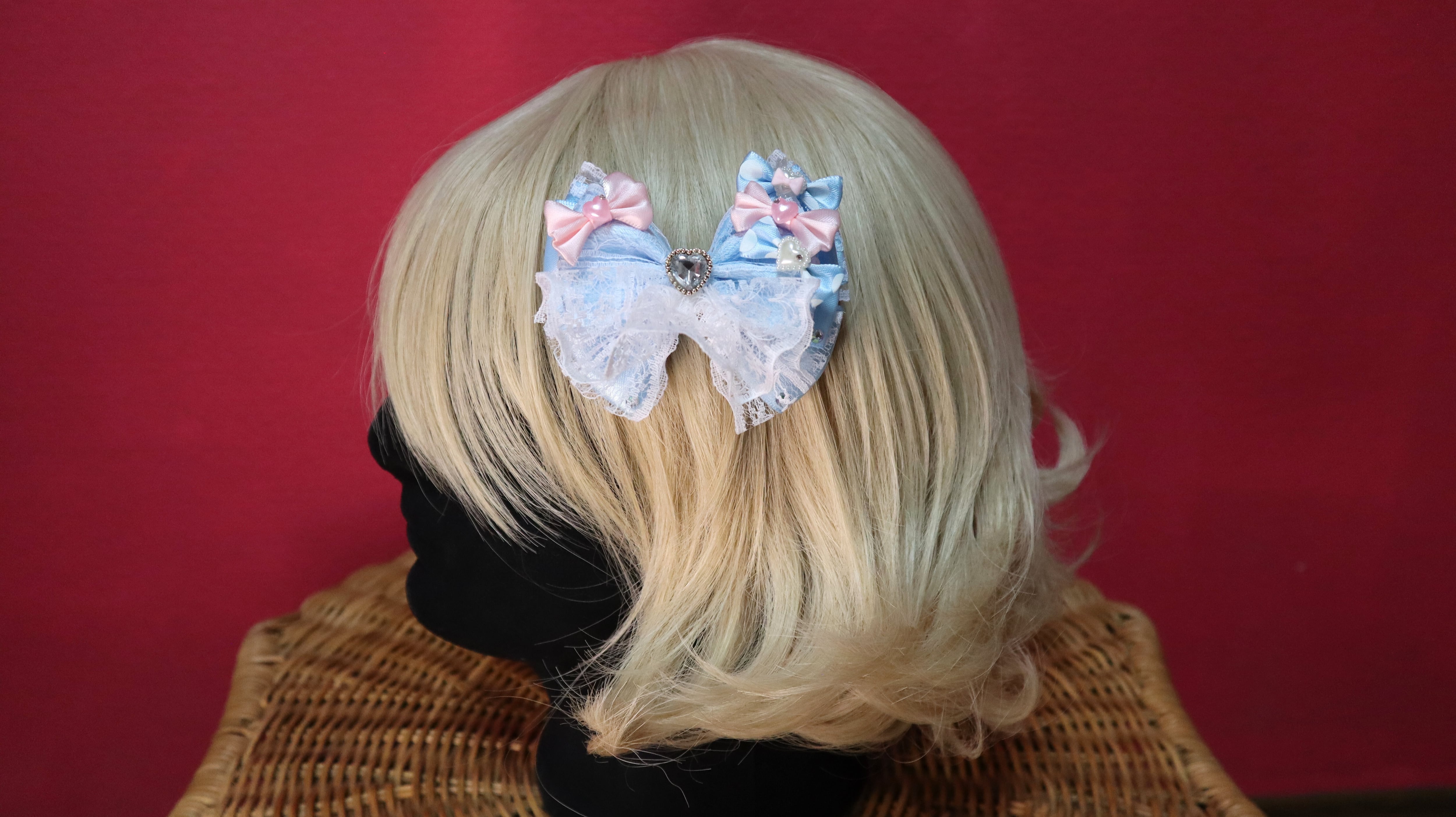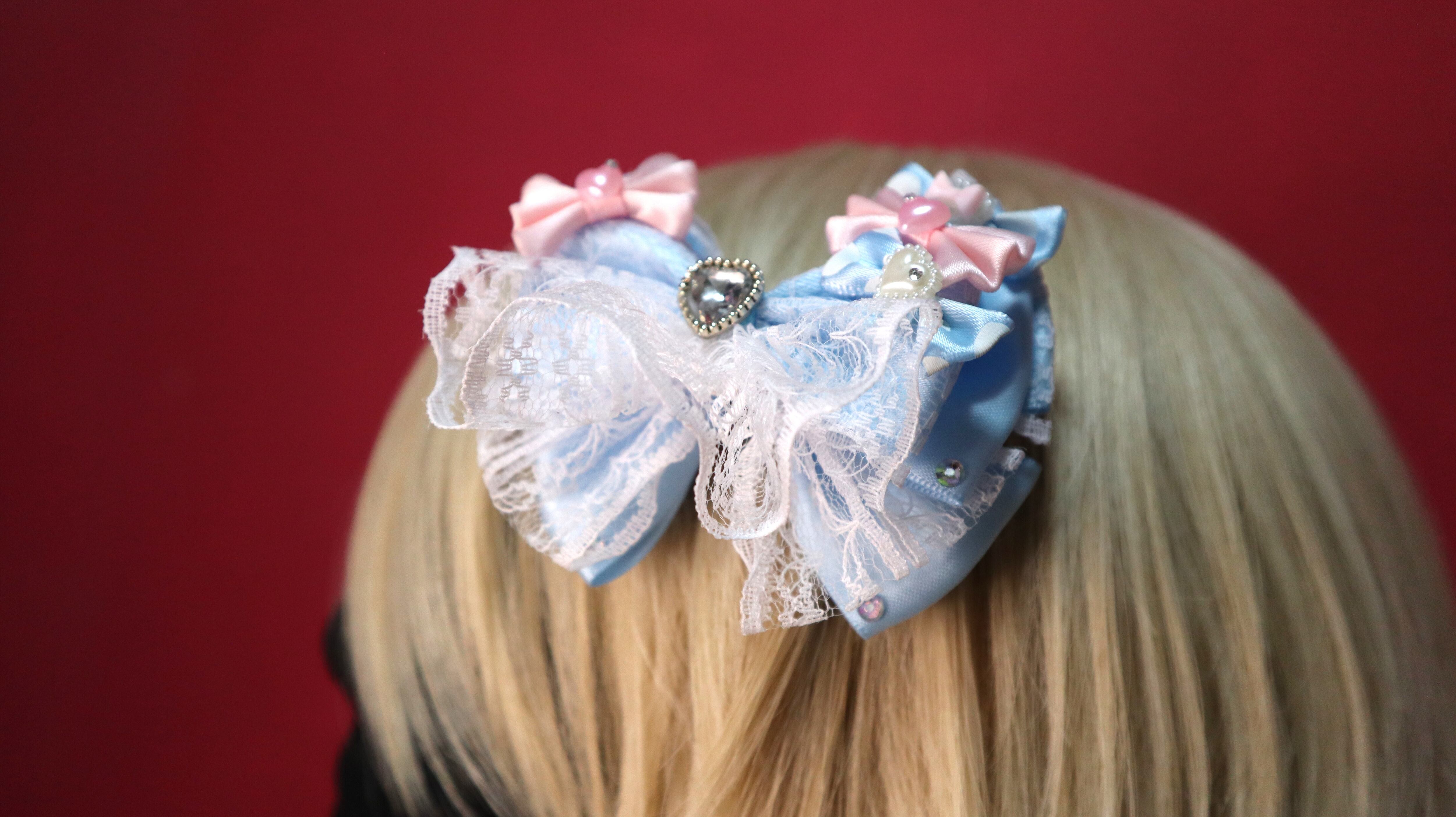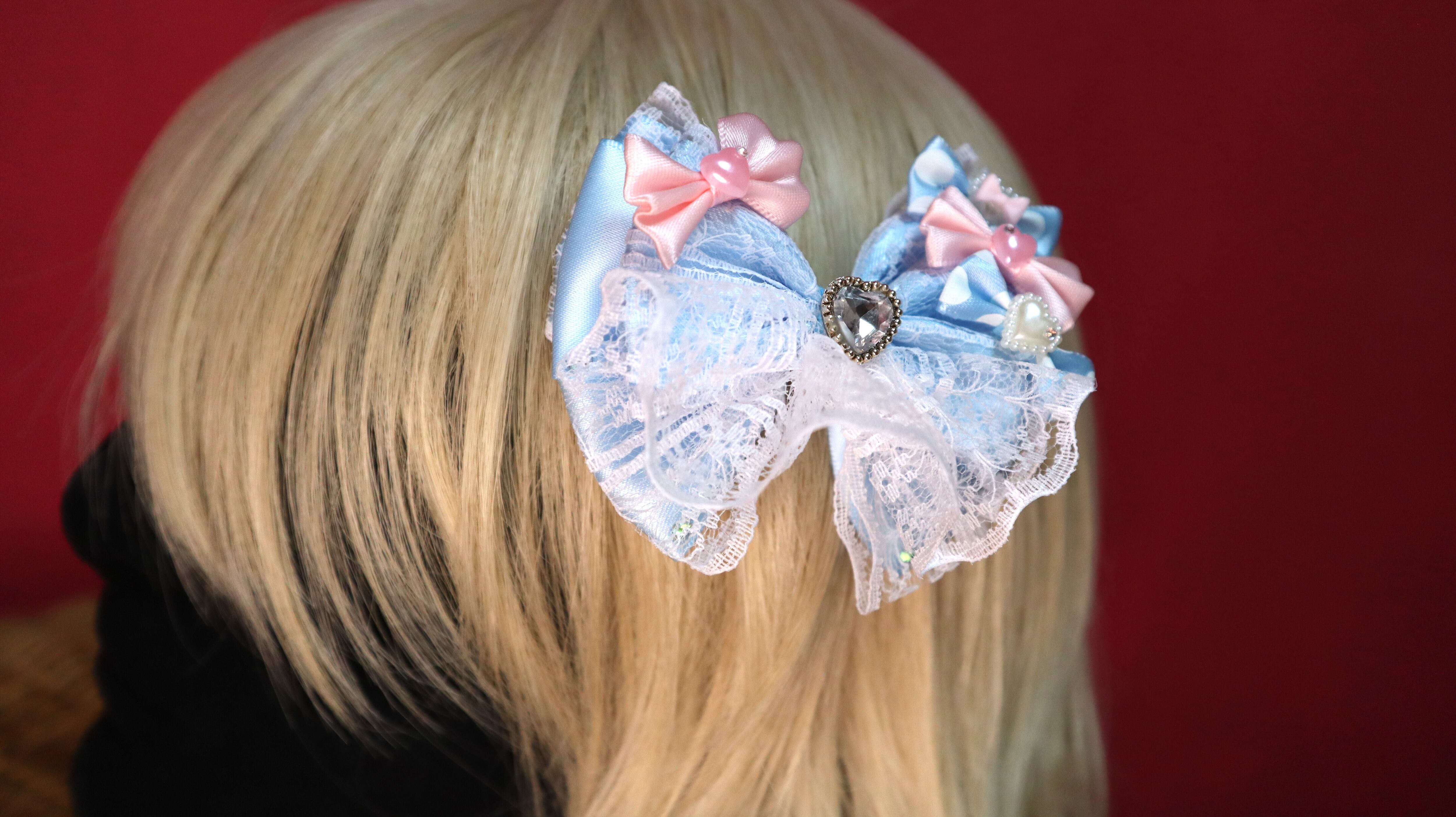 ブルー系/真ん中♡/レースカーテンリボン/レースたっぷり/オソロリボン/ヘアクリップ