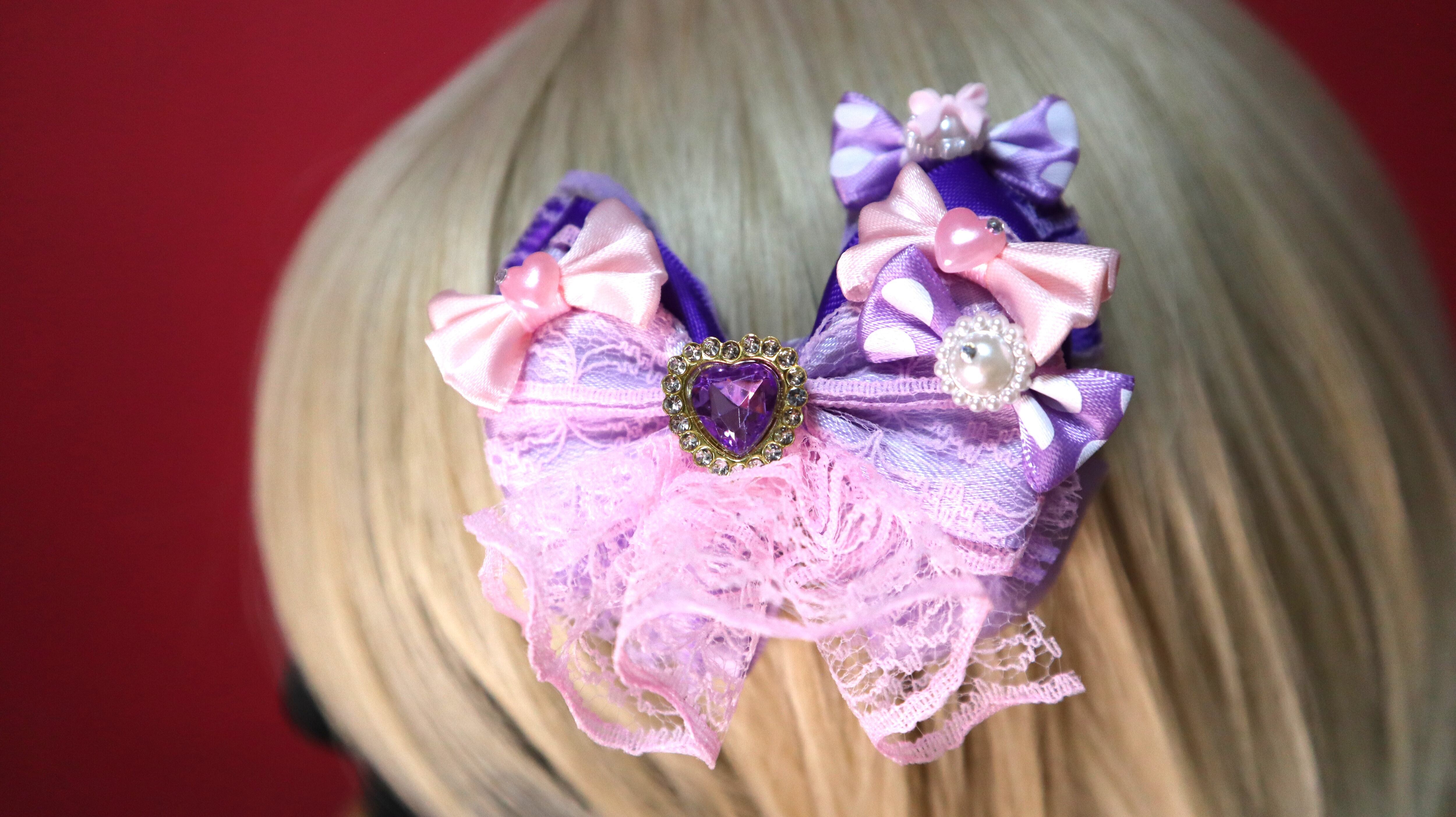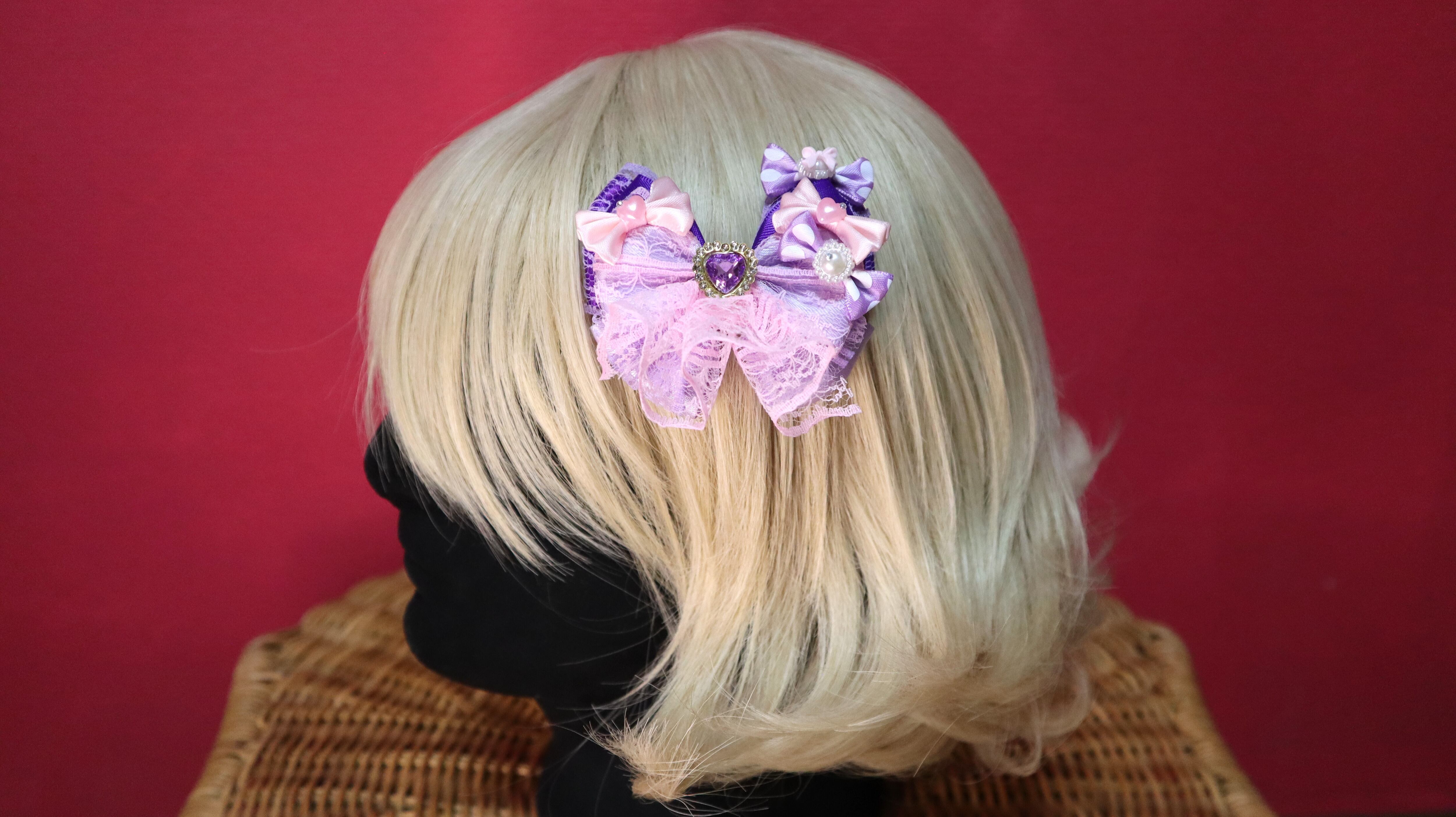 パープル系/真ん中♡/レースカーテンリボン/レースたっぷり/オソロリボン/ヘアクリップ