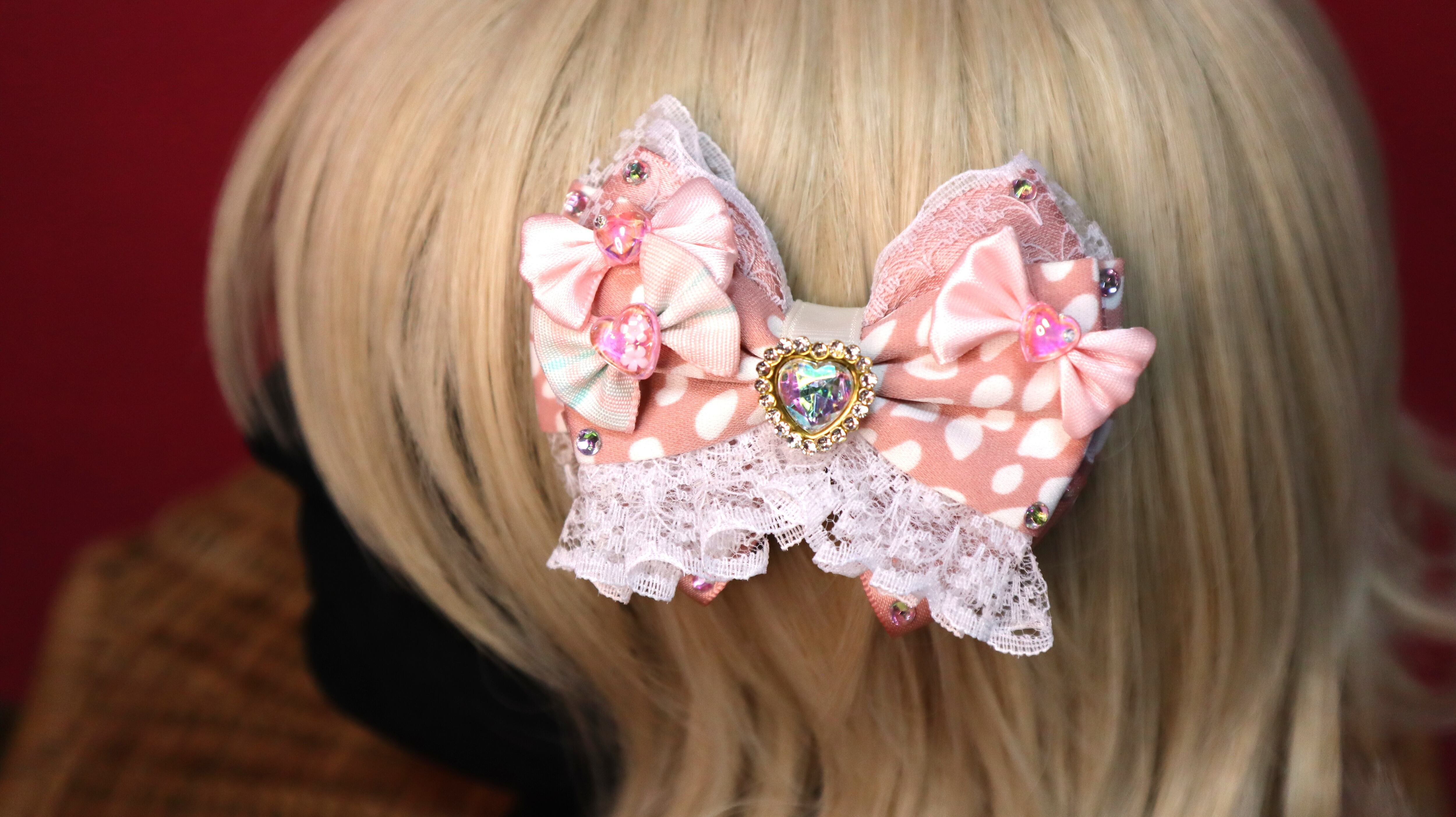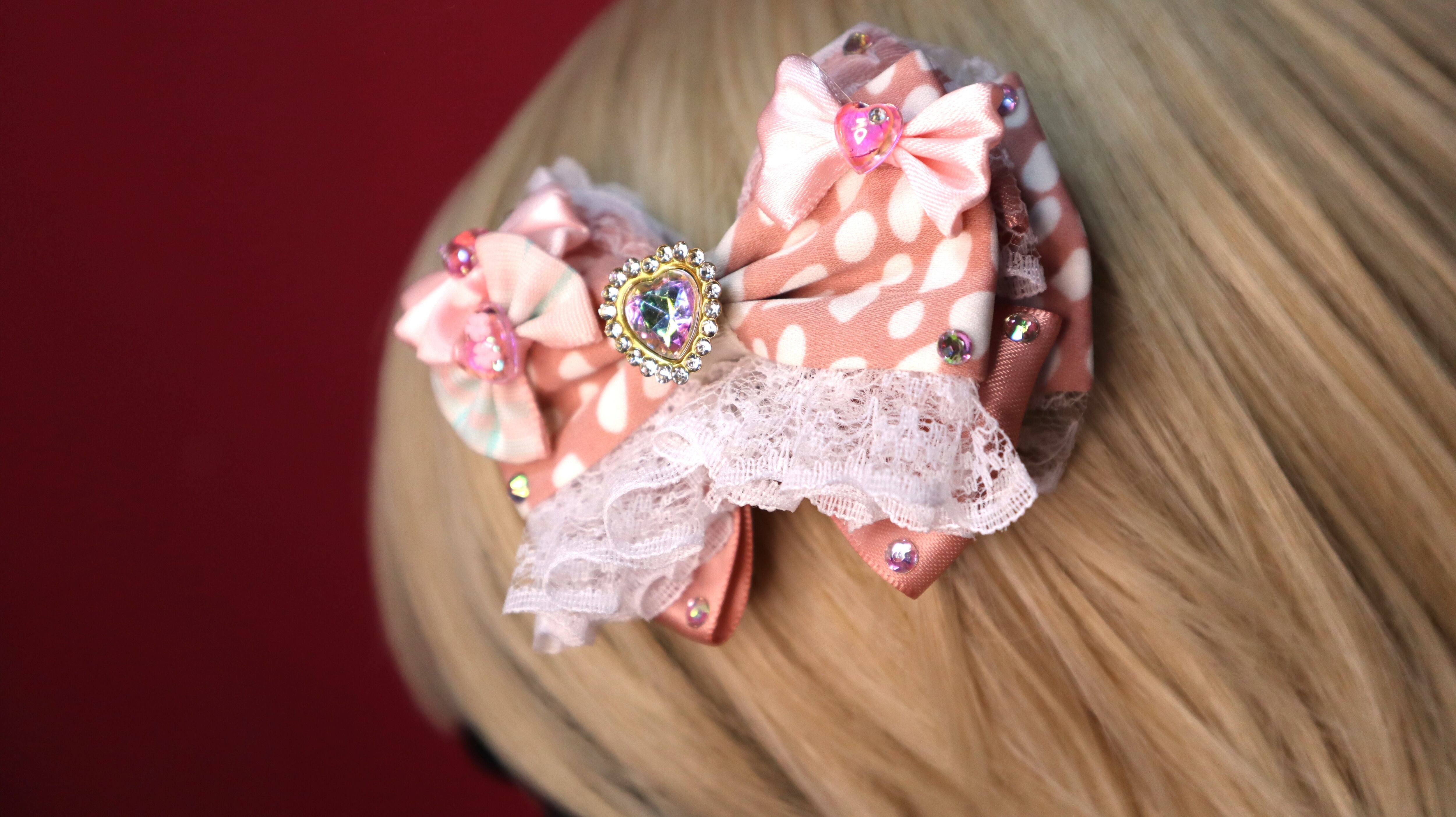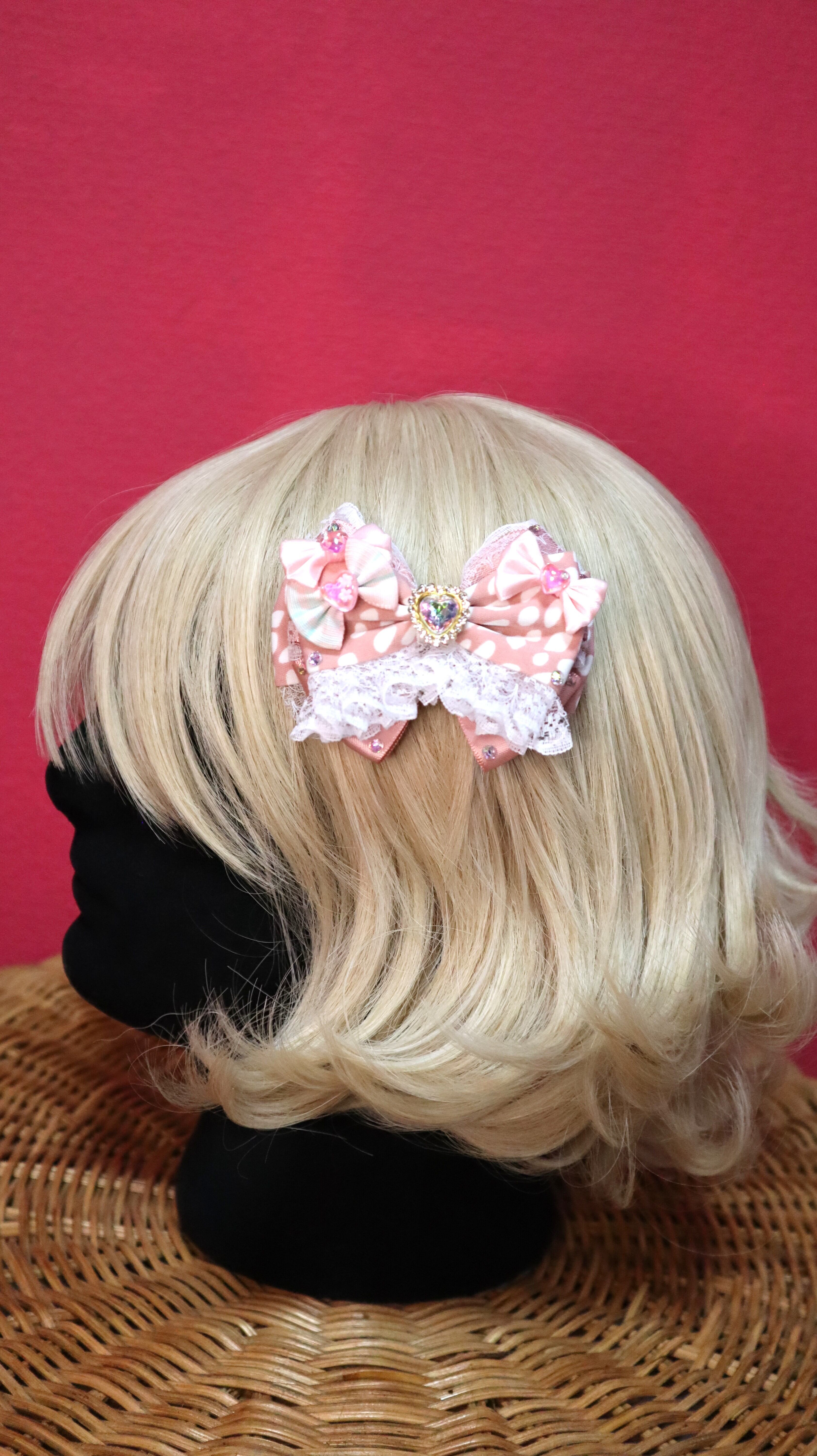 ピンク系/ピンクダルメシアン/真ん中オーロラ♡/レースたっぷり/オソロリボンシリーズ/ヘアクリップ