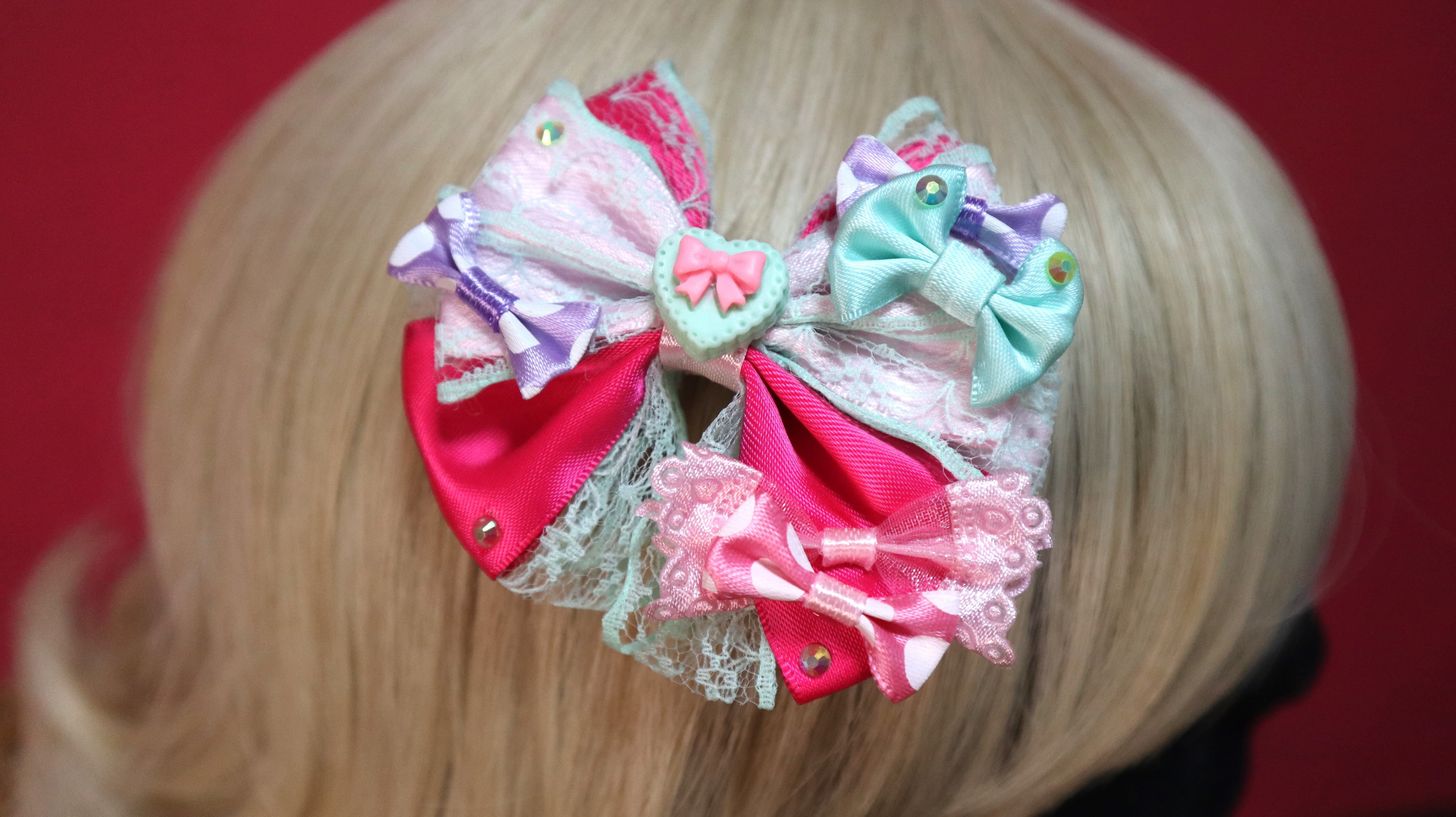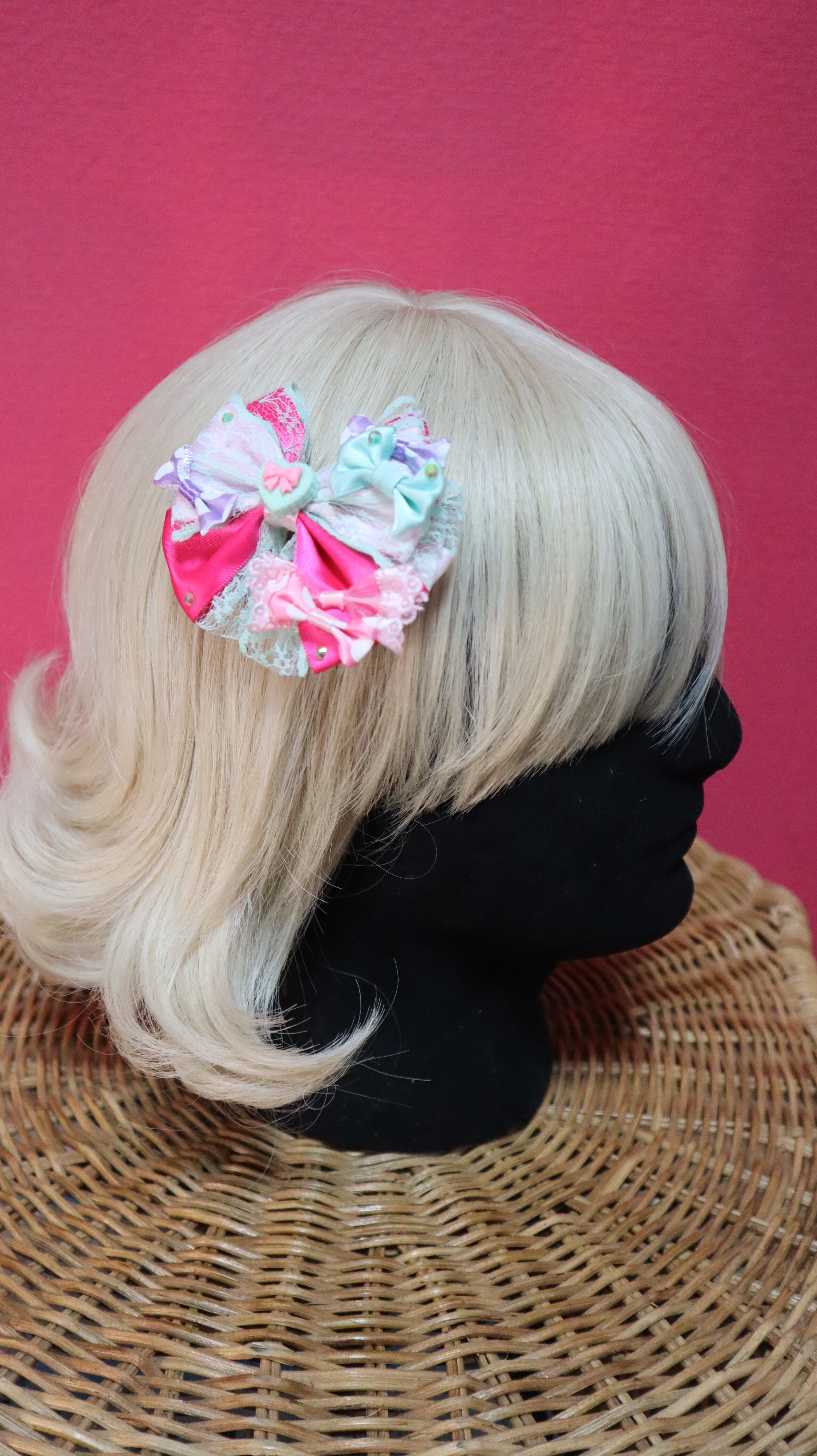 ピンク系/グリーンレース付きリボン/リボンまみれリボンシリーズ/ヘアクリップ
